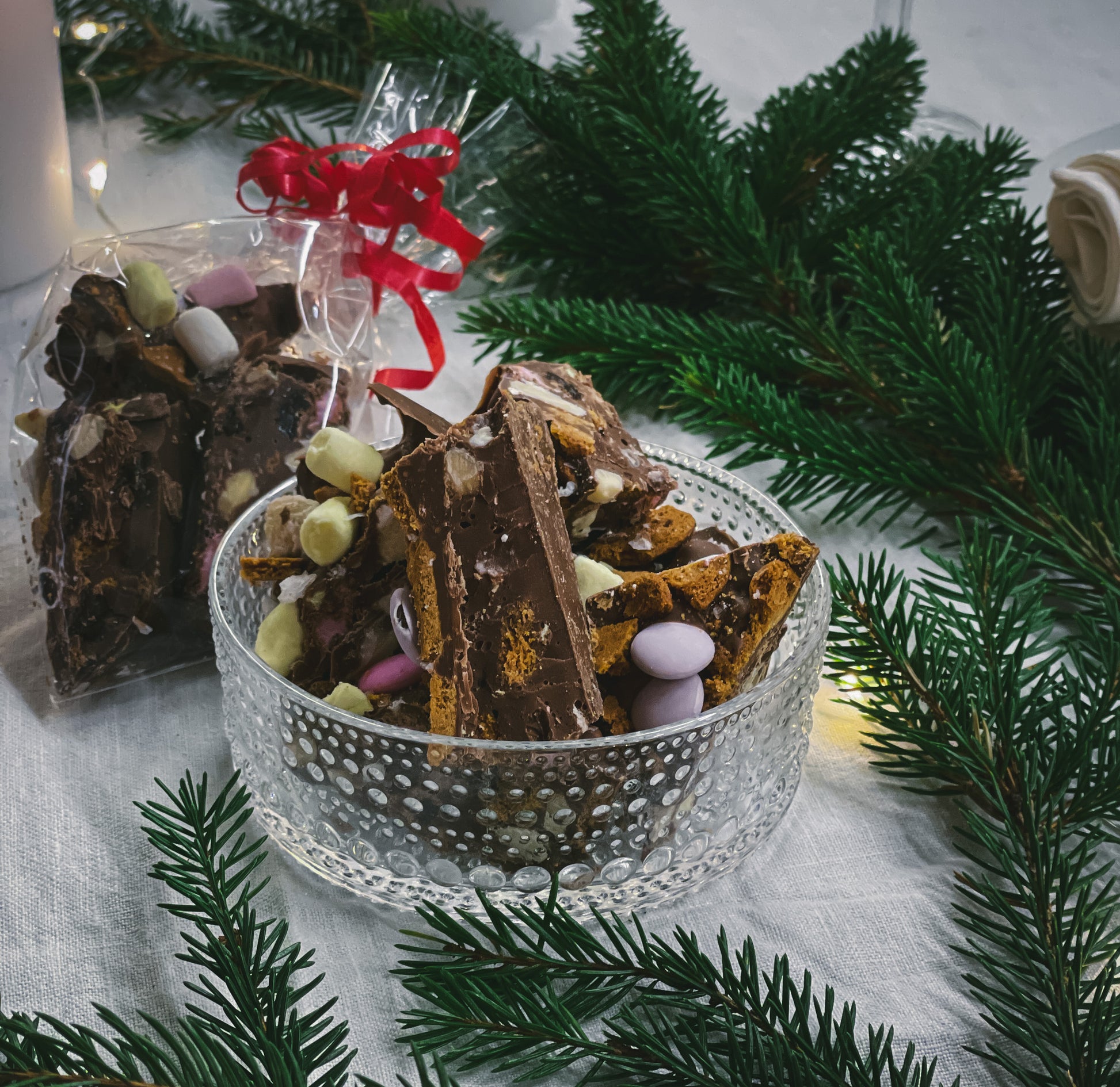 Tämä jouluinen rocky road on vastustamaton yhdistelmä makeaa ja suolaista – täydellinen pieni herkku juhlan keskelle. Maitosuklaan täyteläisyyteen yhdistyvät piparkakun mausteisuus, paahdettu manteli, pehmeät vaahtokarkit, makeat rusinat ja viimeistelevä sormisuola.