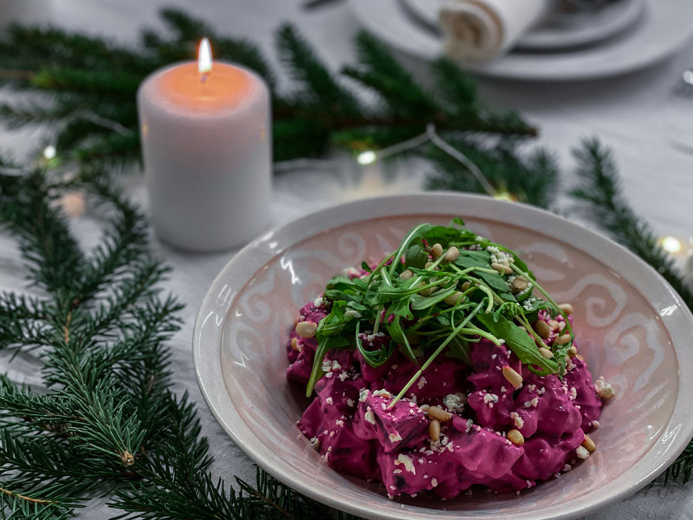Täyteläinen punajuuri-aurajuustosalaatti tuo juhlapöytään raikkautta ja sopivasti särmää. Samettisen kastike yhdistyy paahdettujen punajuurien makeuteen ja aurajuuston rohkeaan makuun – lopputuloksena täydellinen makupari. Pinnalle ripotellut pinjansiemenet tuovat mukaan rapeaa rakennetta ja pähkinäistä vivahdetta.